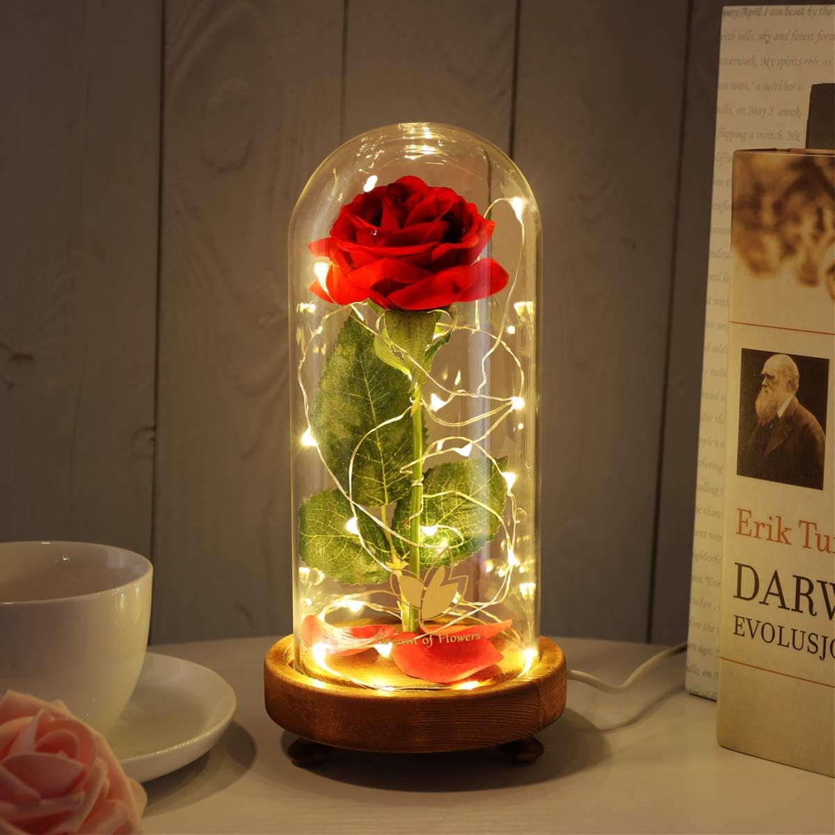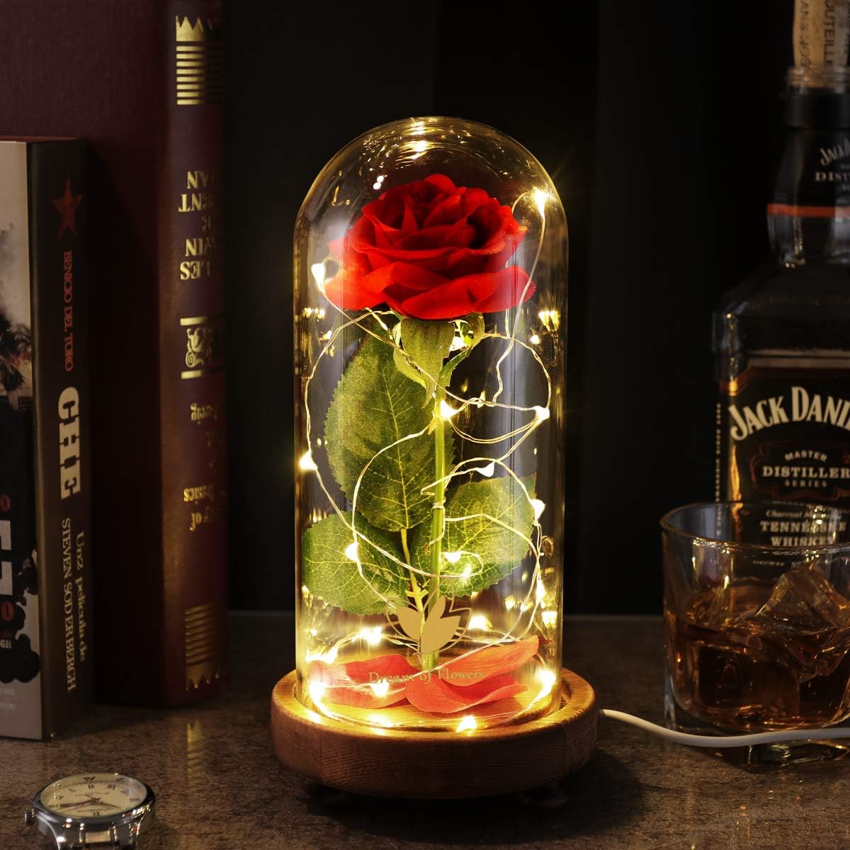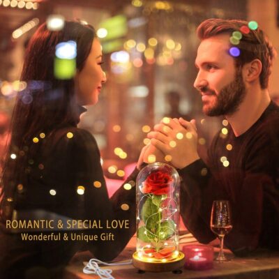 Silk roses are made of soft fabric, producing lifelike flowers. An elegant silk red rose, delicate petals, twinkling lights and glass dome come together in this beautiful arrangement. It’s a sweet and comforting gift that your love truly deserves.