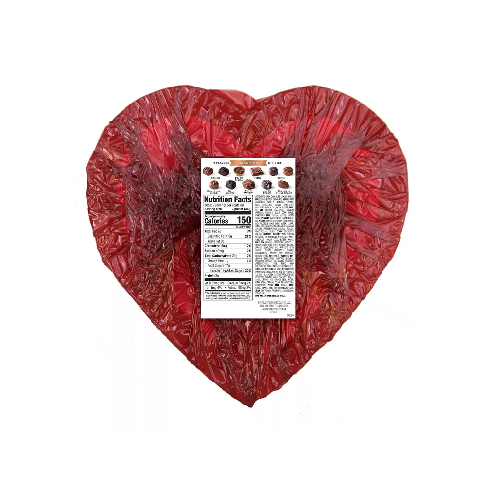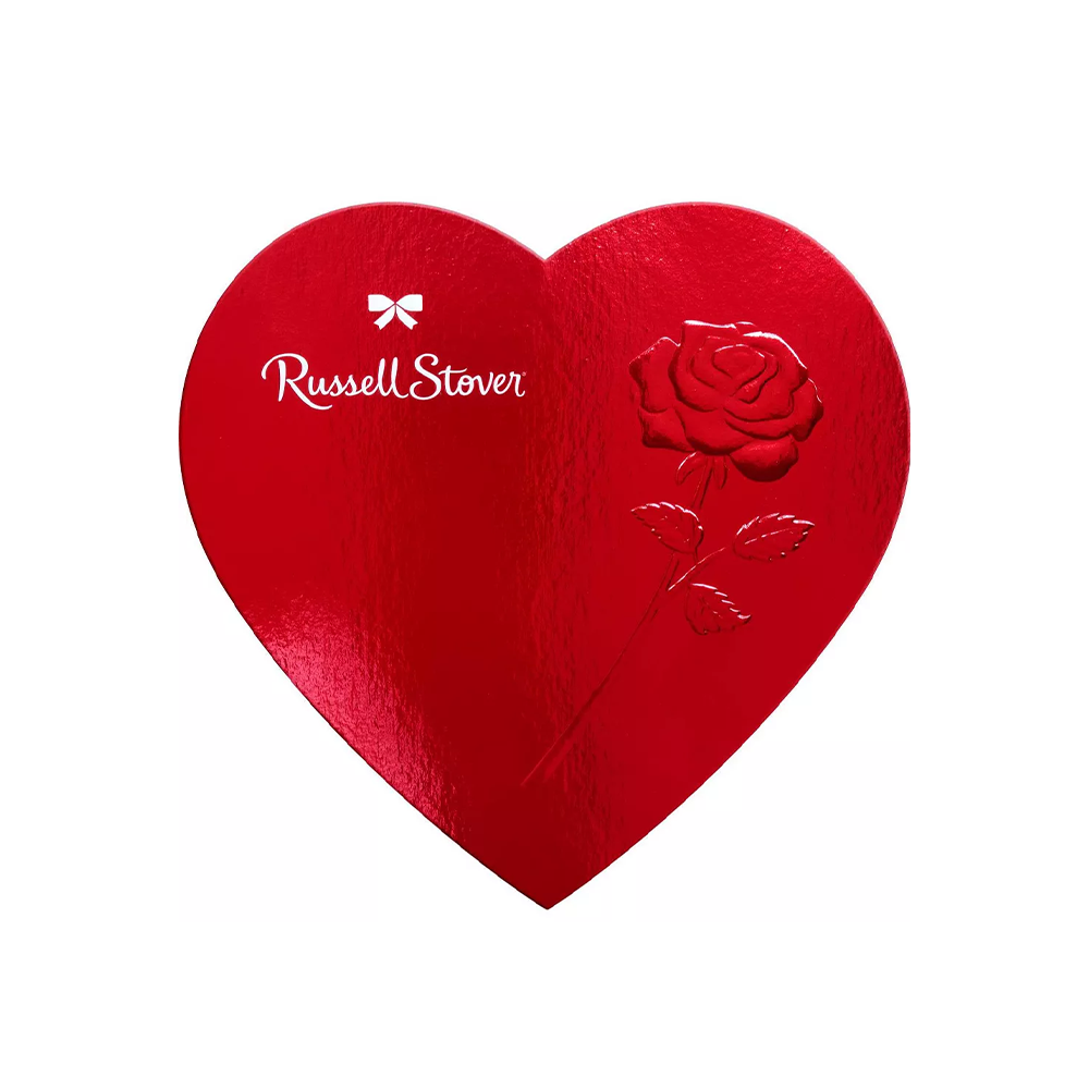RUSSELL STOVER VALENTINE’S ASSORTED CHOCOLATES RED FOIL HEART- 10OZ: