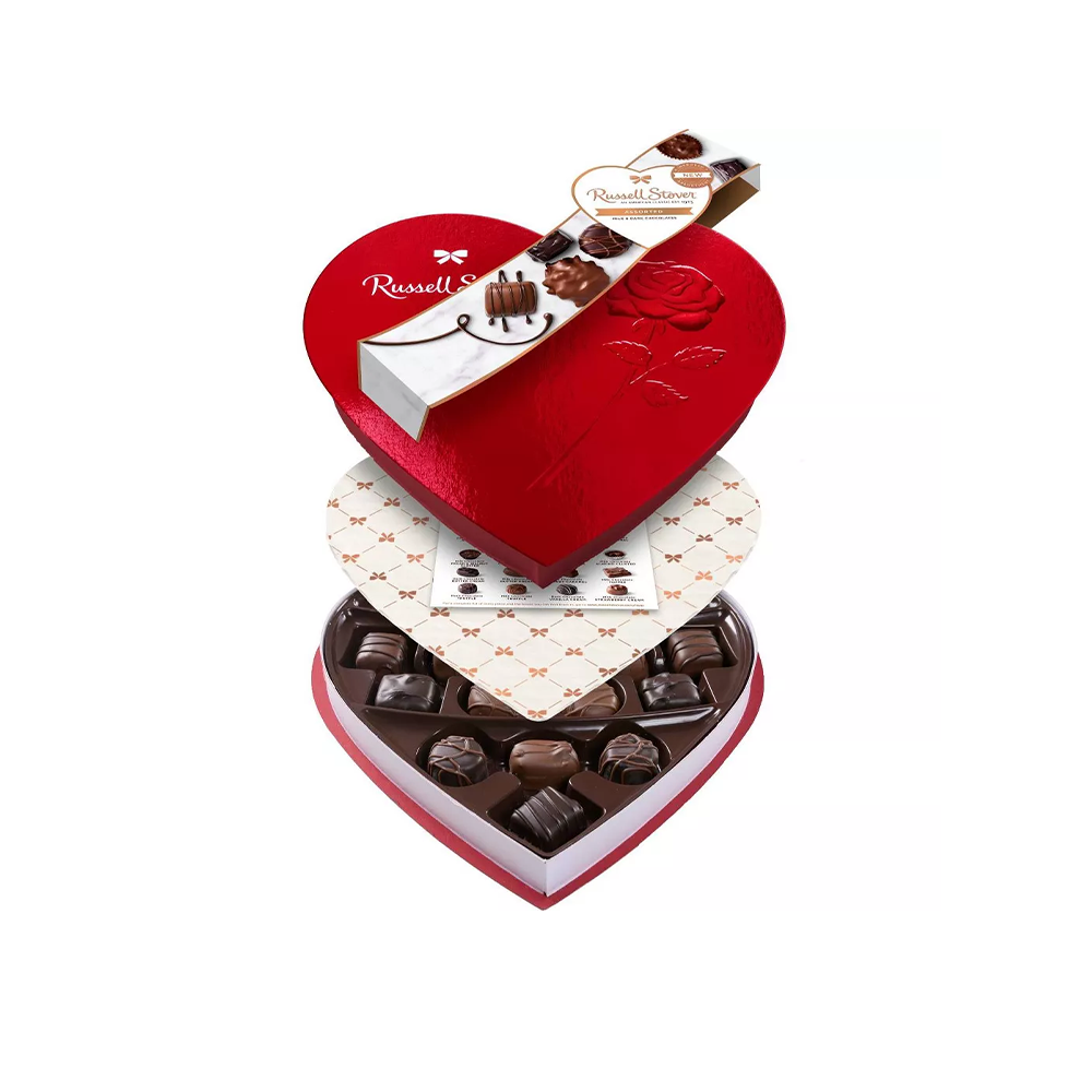 RUSSELL STOVER VALENTINE’S ASSORTED CHOCOLATES RED FOIL HEART- 10OZ