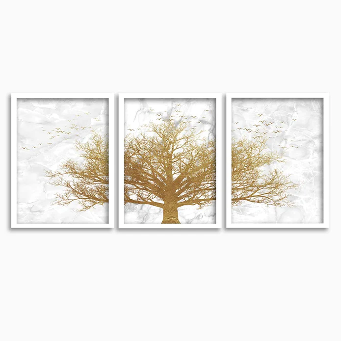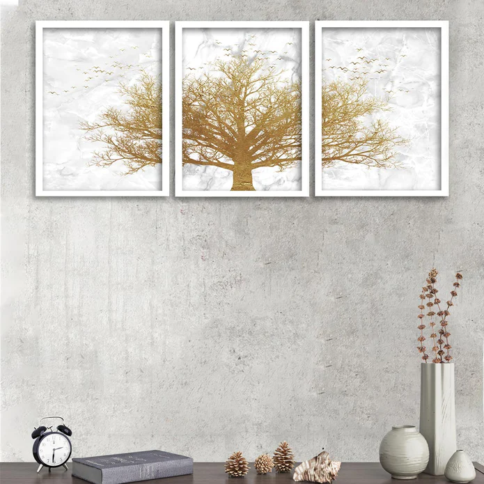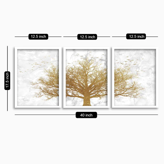 SET OF 3 GOLDEN TREE THEME FRAMED POSTER WHITE FRAME ART PRINTS SIZE; -A3